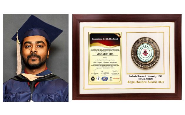 Md Sakib Mia has been honored with the prestigious “Data Analytics Excellence Award”-2025 for his remarkable academic achievement and impactful contribution to advancing data analytics, digital transformation, and technology-driven business intelligence. His recognition highlights a distinguished role in shaping modern digital strategy and reflects the growing global acknowledgment of young Bangladeshi scholars making significant contributions in advanced research.