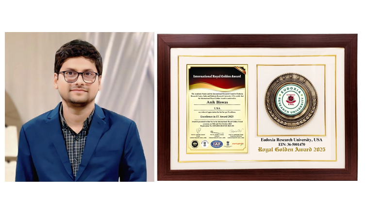 At the prestigious International Royal Golden Fellow Award-2025 Ceremony and the Fourth International Conference on Multidisciplinary Research Trends in European, Asian and African Countries (IRTEC 4.0, 2025), Anik Biswas was honored with the distinguished Excellence in IT Award 2025. The award was jointly presented by Eudoxia Research University, USA and the Eudoxia Research Centre, India.
