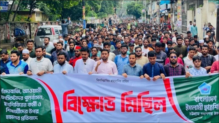 চাঁদাবাজি, সন্ত্রাস, নৈরাজ্য ও শিক্ষার্থীদের ওপর হামলার প্রতিবাদে বিক্ষোভ মিছিল করেছে চট্টগ্রাম মহানগর উত্তর শাখা ছাত্রশিবির। বিক্ষোভ মিছিল থেকে তারা ‘ভিক্ষা লাগলে ভিক্ষা নে, চাঁদাবাজি ছাইড়া দে’ স্লোগান দিয়েছে। যা পরে সামাজিক যোগাযোগমাধ্যমে ছড়িয়ে পড়ে।