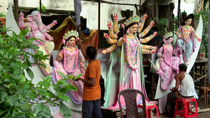 বেশিরভাগ মণ্ডপে প্রতিমা গড়নের কাজ শেষ। এখন চলছে রং-তুলির আঁচড়ে দেবীকে রূপ দেয়ার কাজ। সাধারণ মাটির তাল ভেঙে ধীরে ধীরে এই মহাশক্তিকে আকার দেয়ার কাজ শুরু হয় মাস তিনেক আগেই। এখন শুধু বাকি রং-তুলিতে দেবীকে পূর্ণতা দেয়া। কোনো কোনো মণ্ডপে রঙের কাজ প্রায় শেষ, কোথাও আবার কেবল শুরু হয়েছে দেবীকে রাঙিয়ে তোলা।