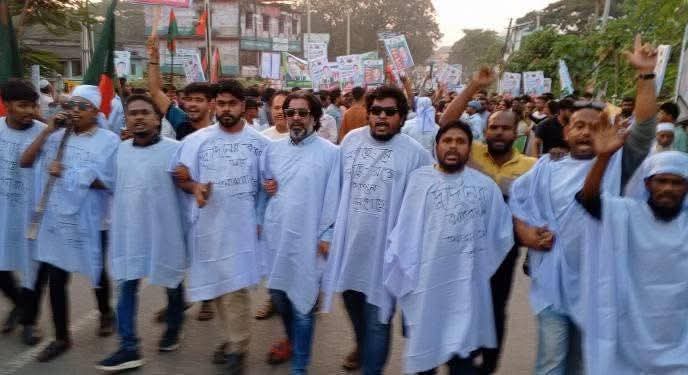 কসবা-আখাউড়ায় জানাজার কাফন পরে হাজারো মানুষের বিক্ষোভ মিছিল